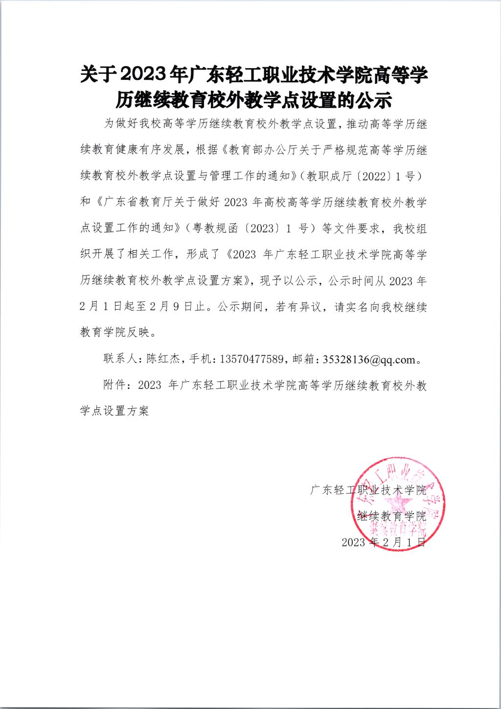 信息名称:关于2023年广东轻工职业技术学院高等学历继续教育校外教学点设置的公示