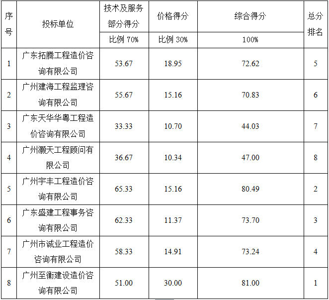 广东轻工职业技术学院就工程造价咨询服务单位项目进行校内招标,在规定时间内共有10家投标单位递交投标文件,经过评标小组的评审, 广东粤能工程管理有限公司因投标报价不是唯一的且重大不合理、广东飞腾工程造价咨询有限公司因无工程造价资质证明文件均不通过资格性和符合性审查,其余8家投标单位均通过资格性和符合性审查。技术、商务及价格总分排名如下:
