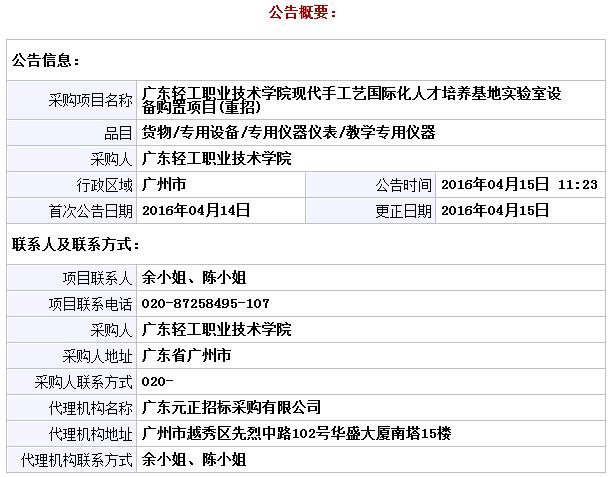 原公告项目名称:广东轻工职业技术学院现代手工艺国际化人才培养基地实验室设备购置项目(重招)(招标编号:0835-1501111N4291C1)招标公告