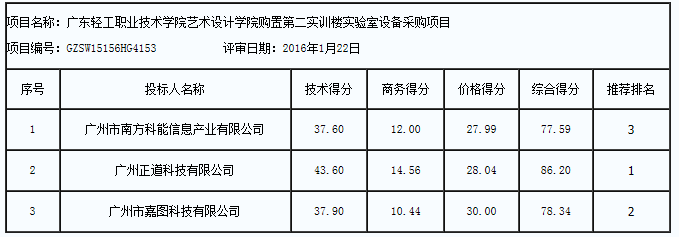 广州顺为招标代理有限公司受广东轻工职业技术学院的委托,于2015 年12月31 日就艺术设计学院购置第二实训楼实验室设备(201511-156021-0239)采用公开招标进行采购。现就本次采购的中标(成交)结果公告如下: