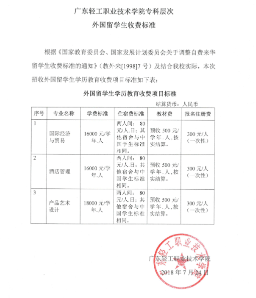 广东轻工职业技术学院专科层次外国留学生收费标准的公示